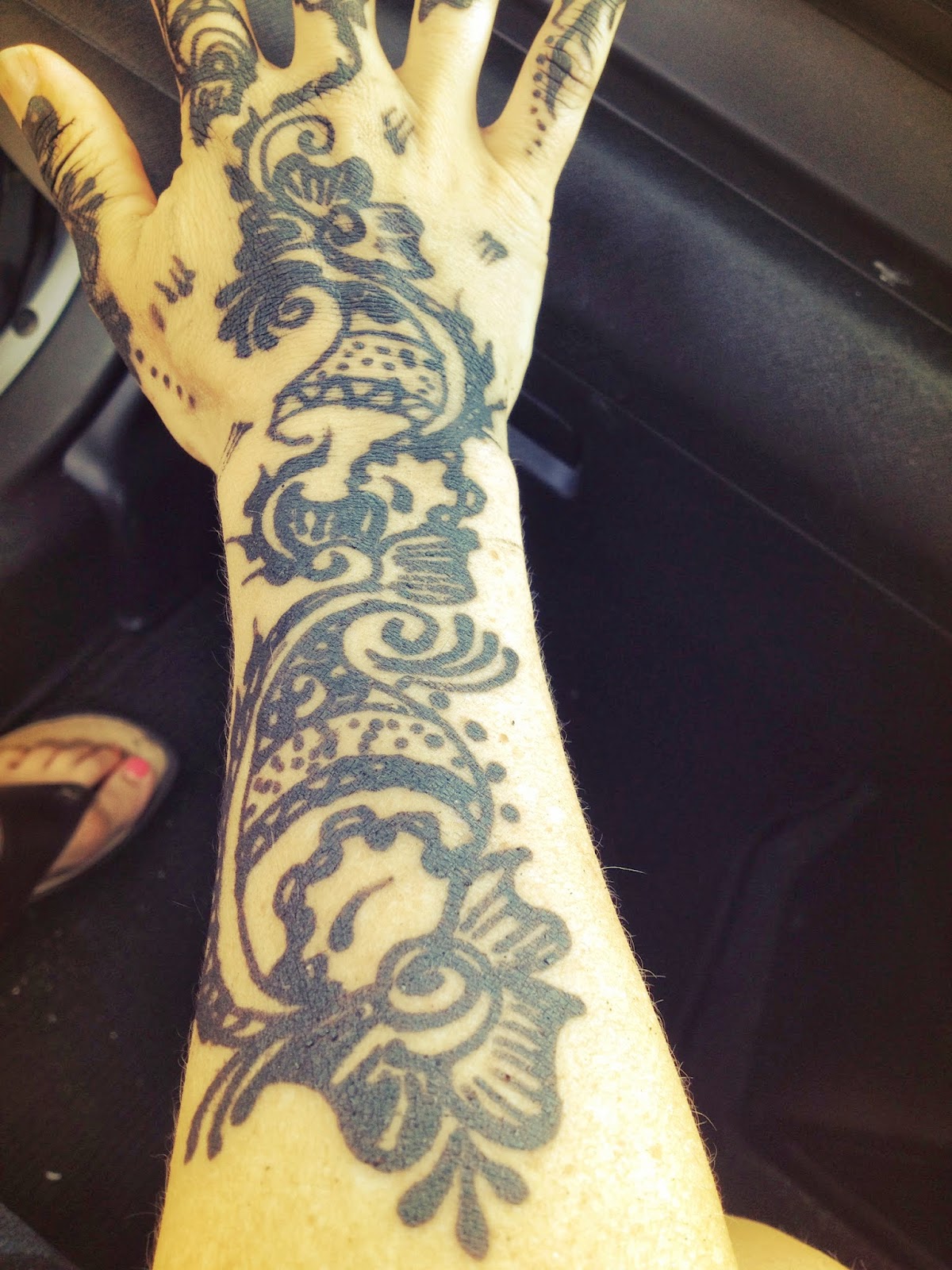 I did go in and get some henna tattoos on my hands before the event, not really understanding what it involved! It only took about 15-20 minutes, but then it had to dry for about 2 hours! Both hands looked like the photo below, which made it impossible to do anything… so I had to call Richard (which was a challenge) and have him come and get me, then he had to help me in the car and put my seat belt on. Then 2 hours later I had to peal off the top layer of this. I also thought it would me much lighter- so my hands and arms are going to look like this for the next 2 weeks!