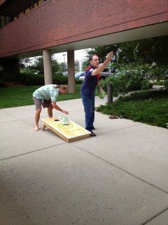 We then headed over to pick up Jenny from work and watched her office finals of “corn hole”, which Richard got a lesson on how to play. Jenny’s team took first place!