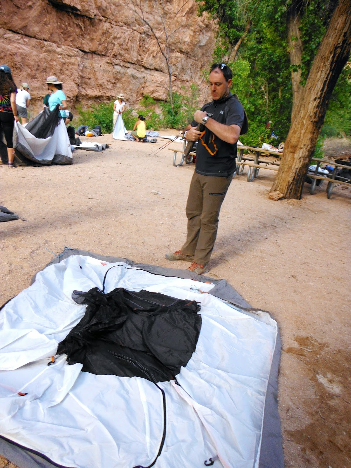 First things first when we arrived at the campground was a trip to the restroom for me! Then to our surprise we were given our tent to put up… We managed to get it up mostly on our own.