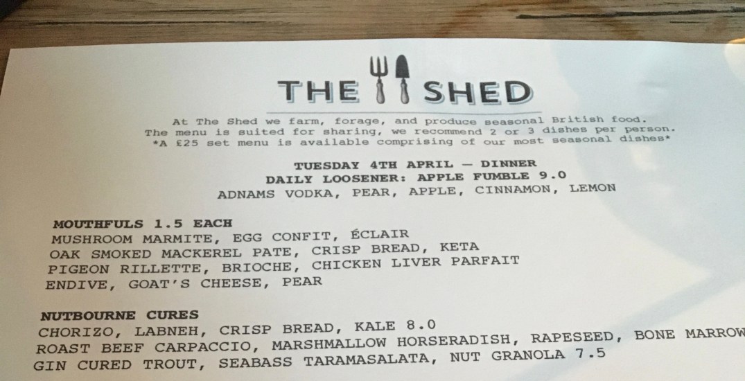 I went to dinner tonight at a place called The Shed. They farm and harvest most of their food about 25 miles outside London. The menu is made for sharing and it was just me, so I was forced to eat all of it! It was one of the best meals I have had since we went to the Michelin Star restaurant in Spain.