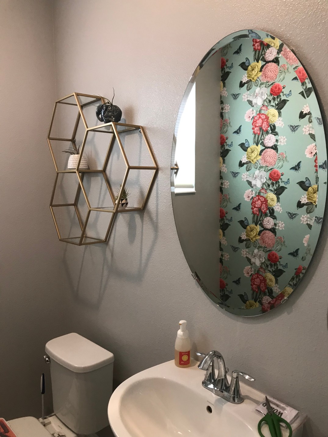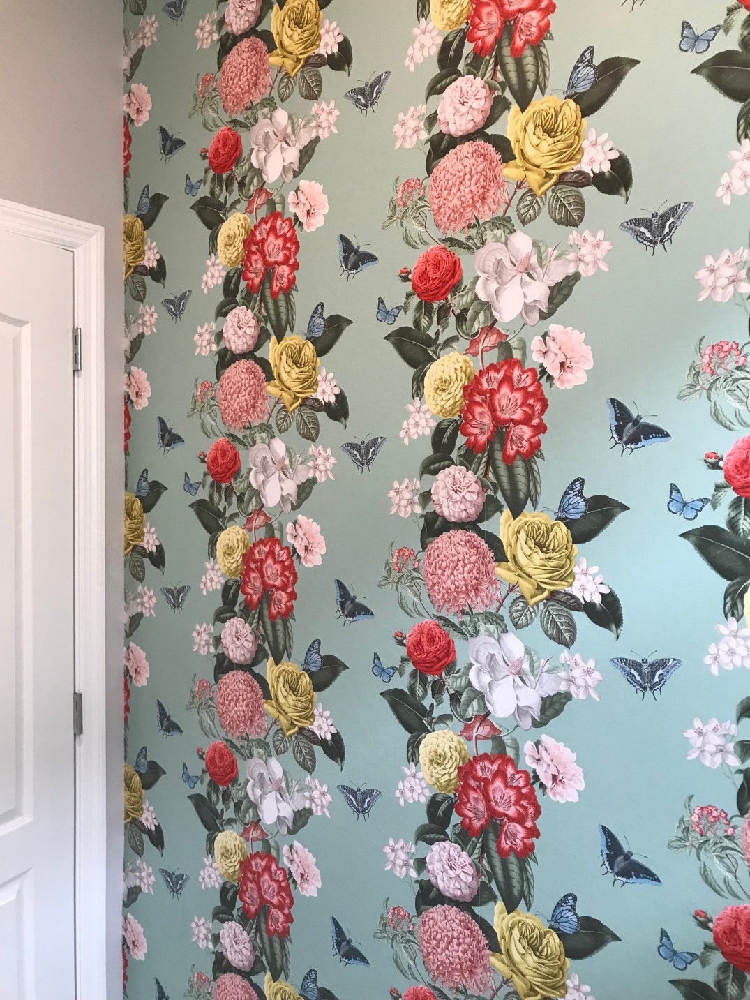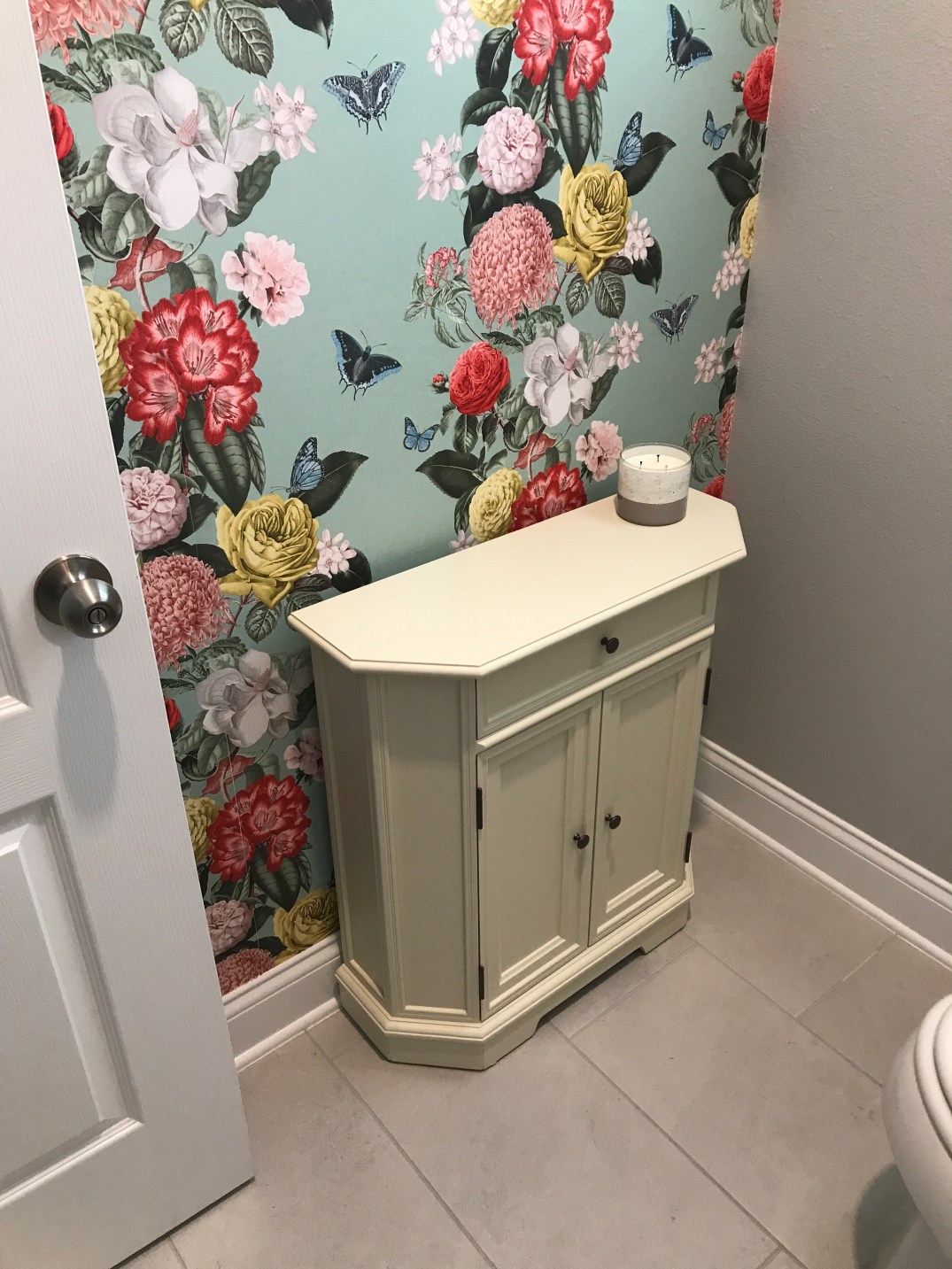 I took on another project around the house. I wallpapered one wall in the 1/2 bathroom, got a new shelf and cabinet and added some new plants.