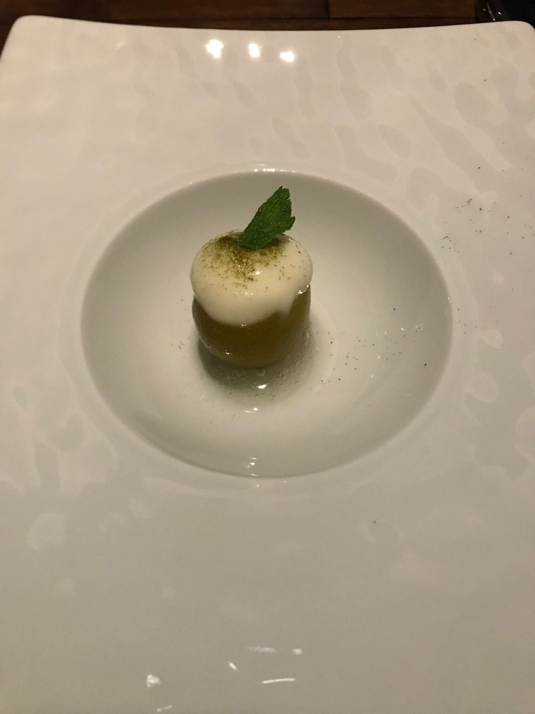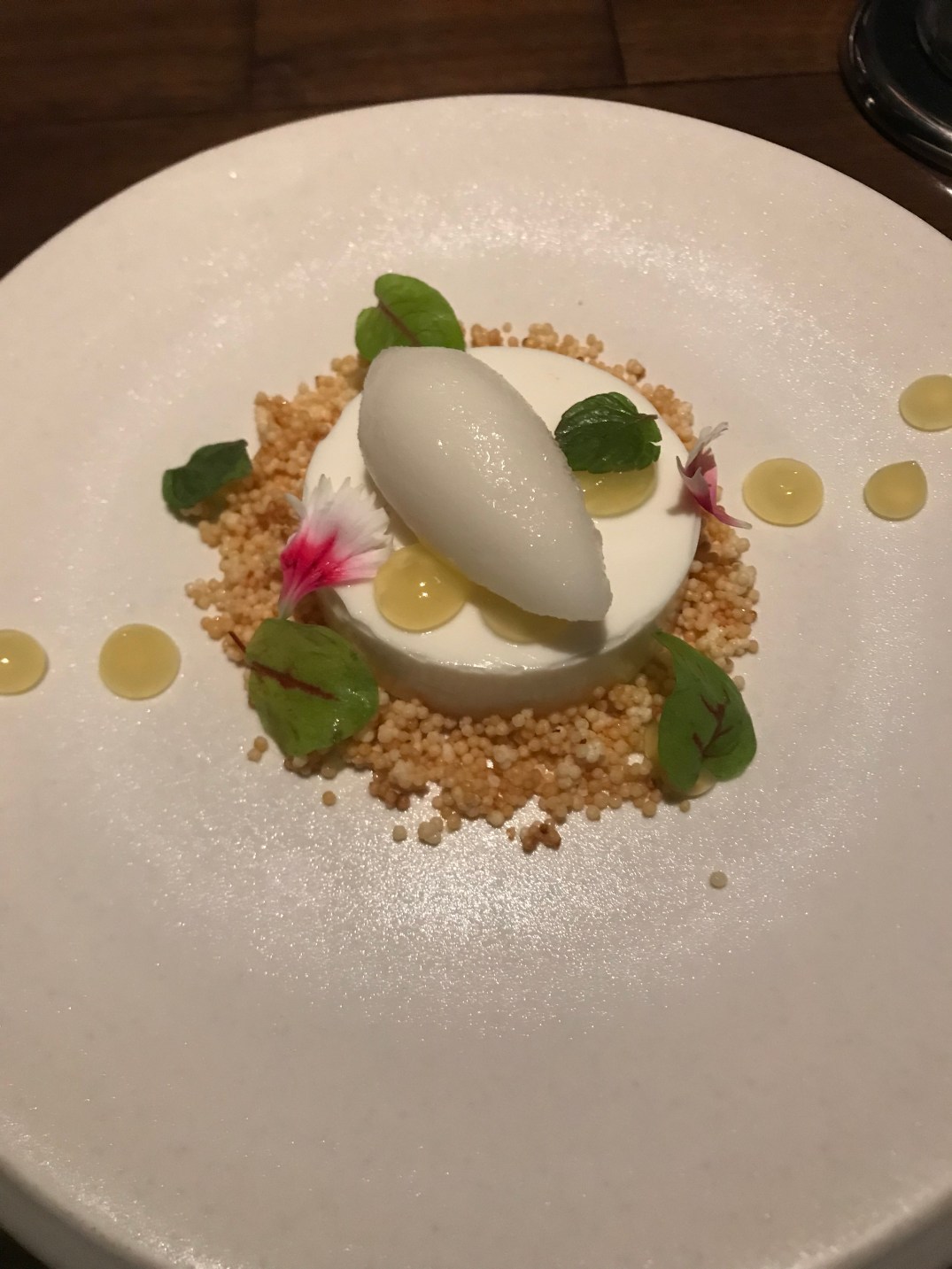 We ended with Pistachio. It was a white chocolate cream with a cherry sorbet and a lemon balm cake.