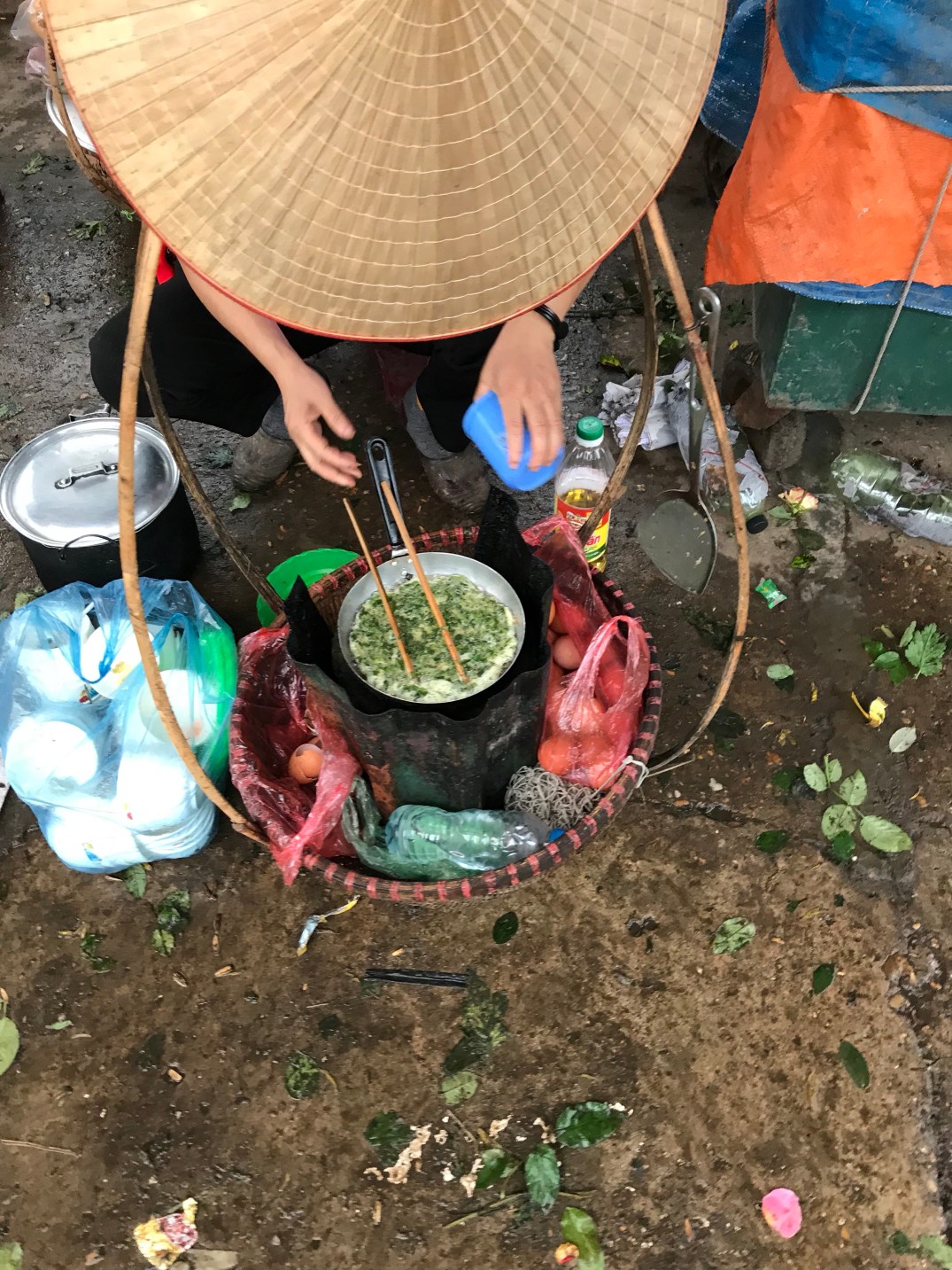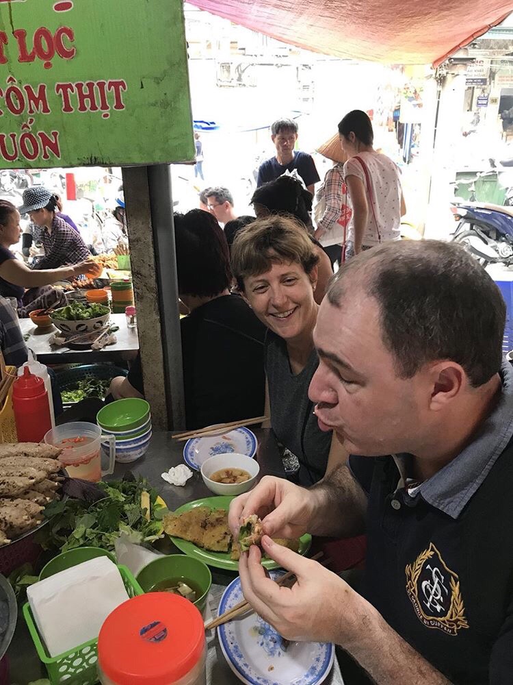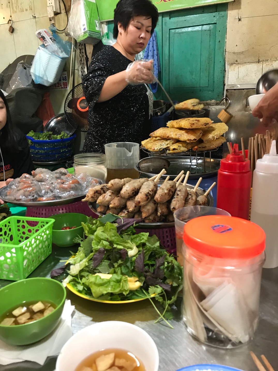 This was one of my favorite foods it was an egg pancake sort of thing with shrimp and vegetables inside. Then you wrapped it in rice paper with some fresh lettuce.