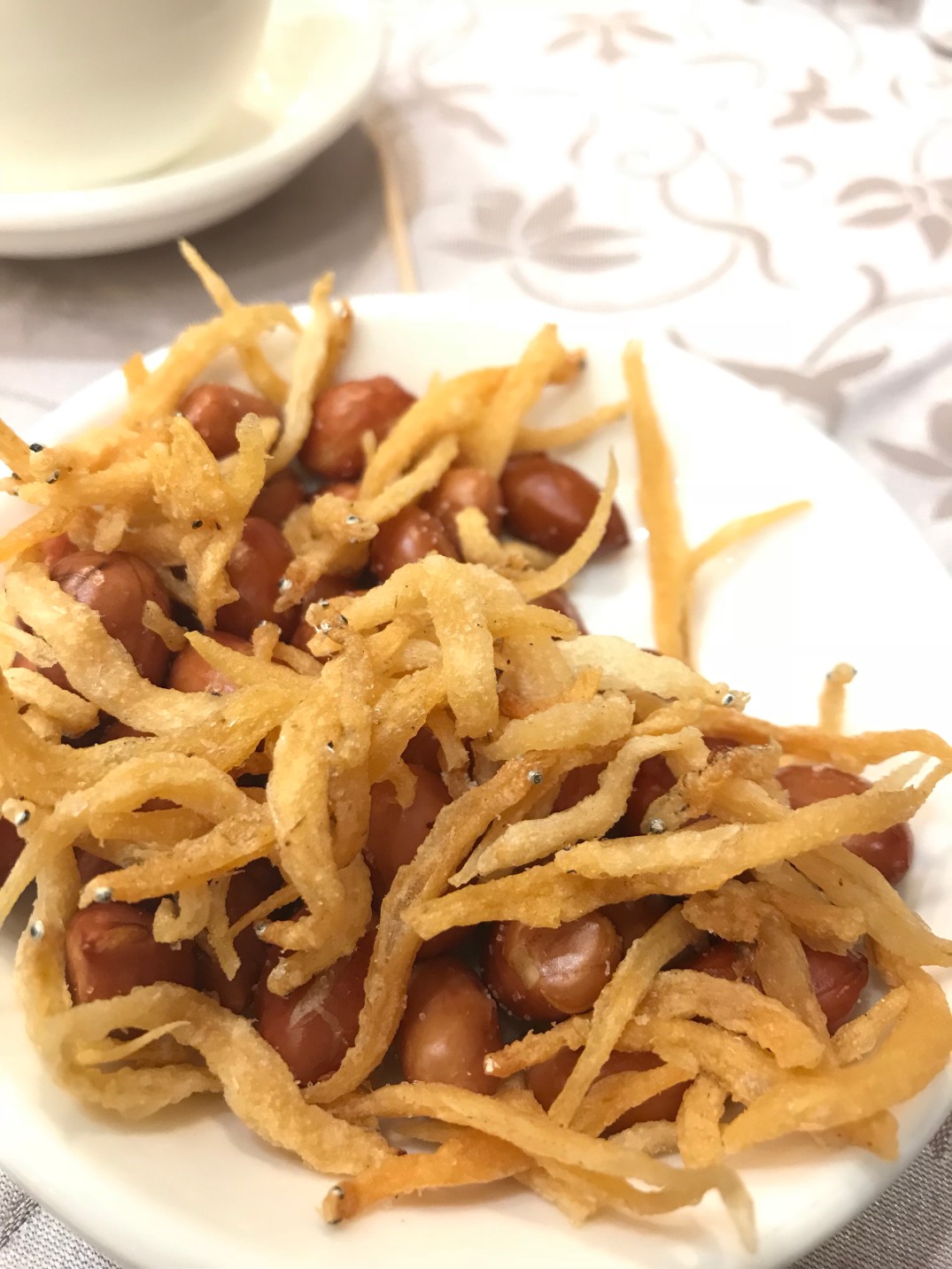 Some various foods. These are what kids would eat for an afternoon snack. Rice paper rolls, fish balls, and something filled with fish balls. All covered with a peanut type of sauce.