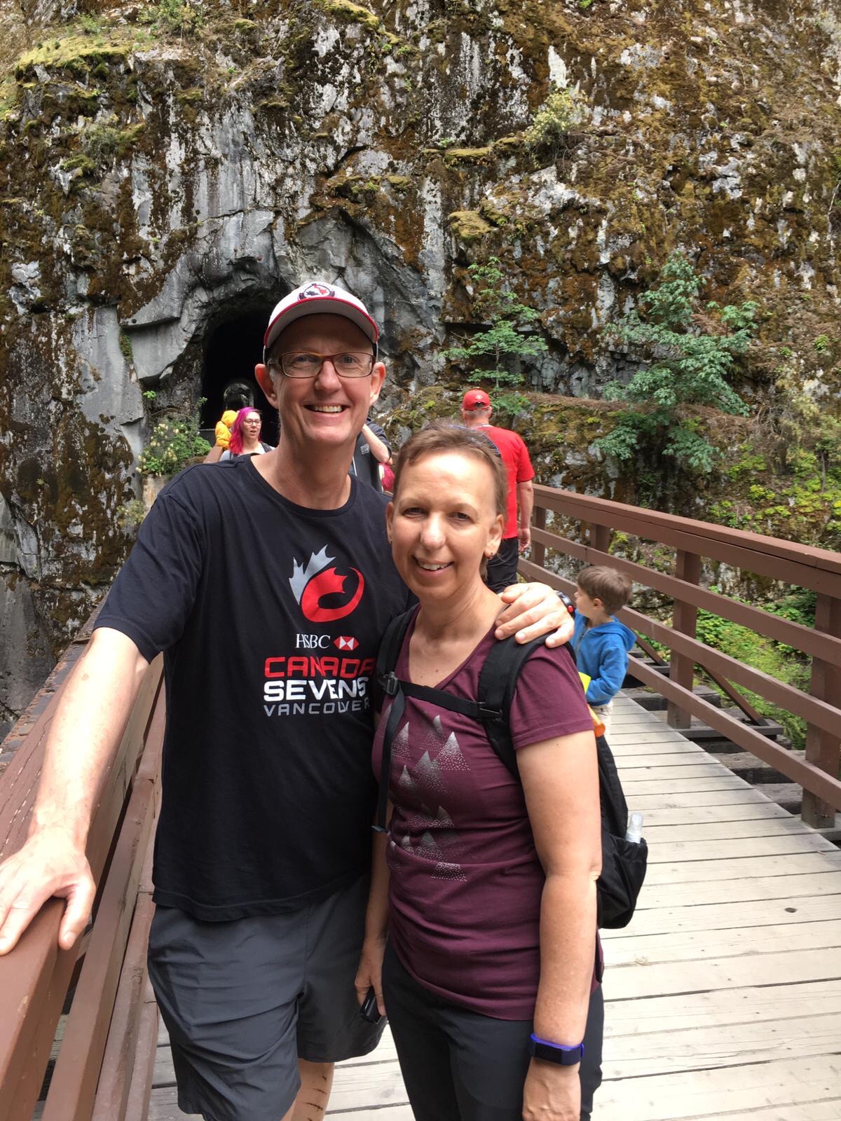 Today Steve and Sue took me inland (eastward parallel to the US border) across to Abbotsford and Hope. We stopped midway for a quick coffee before continuing on to Bridal Falls. Thankfully it wasn’t much of a hike up but the view was beautiful as was the forest on the way up. We continued on to the Othello tunnels where there are a number of abandoned railway tunnels from a now disused railway line. It was great to see the river running deep below where the railway lines had run, various tunnels having been blasted through the rock. We stopped for a late lunch back in the small town of Hope before taking the scenic route back home.