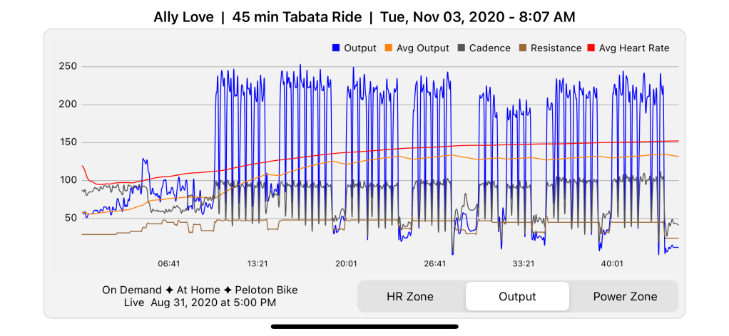 Today I attempted the toughest ride on the Peloton platform. A 45 minute Tabata ride. A Tabata ride is basically 20 seconds of cycling as hard as you can with a 10 second break to catch your breath. This morning I did 56 of these.