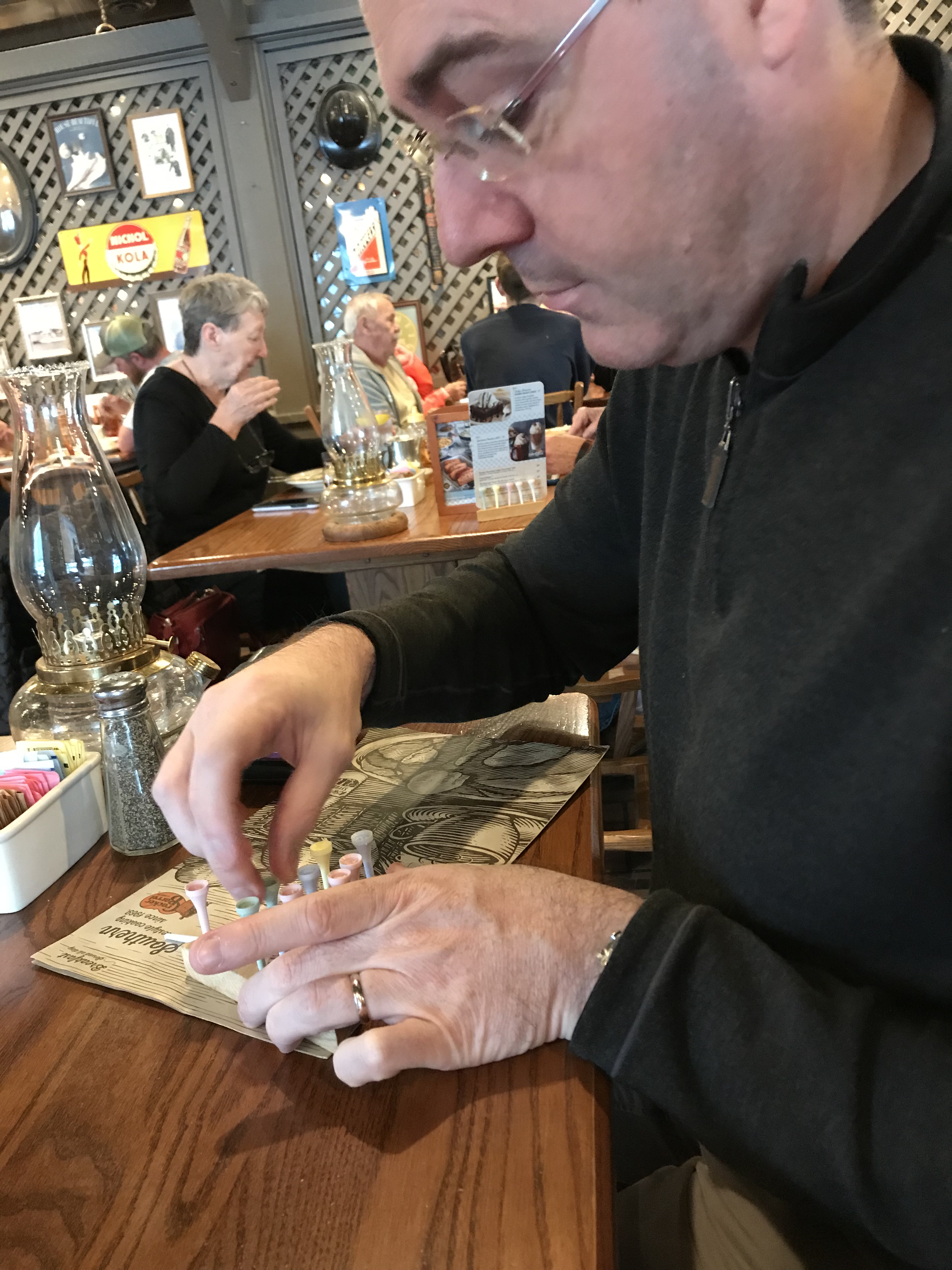 They still have the golf tee game on the tables. Unfortunately we were unable to figure it out, but Kristie was kind enough to get one for Richard to take home!