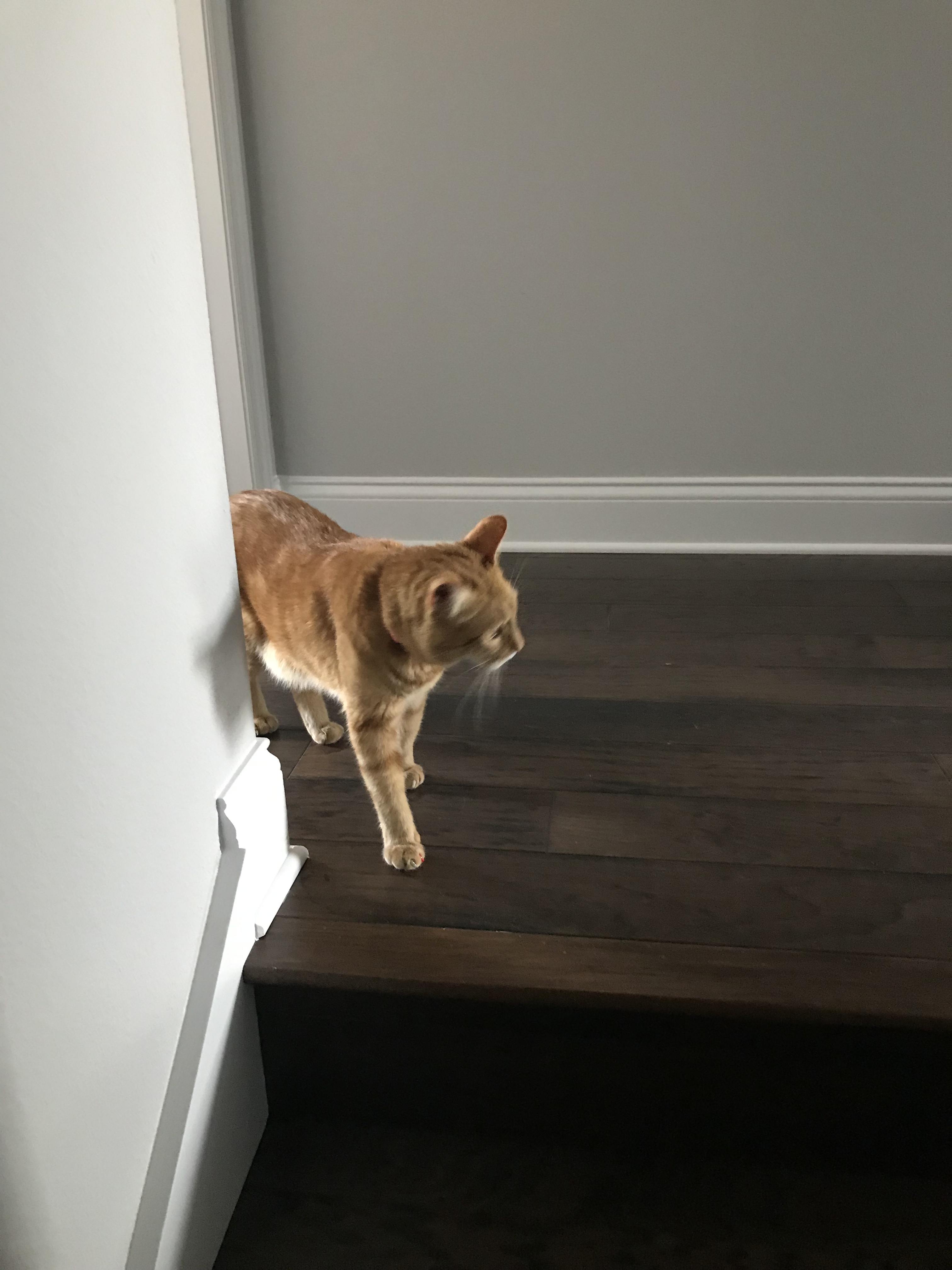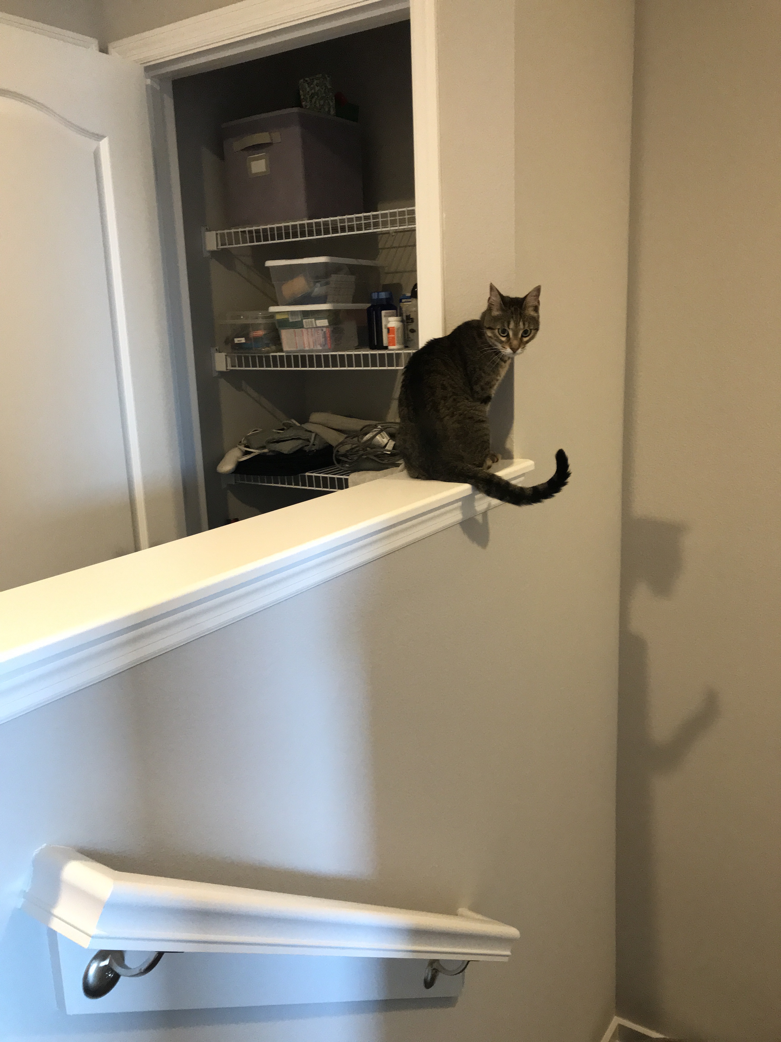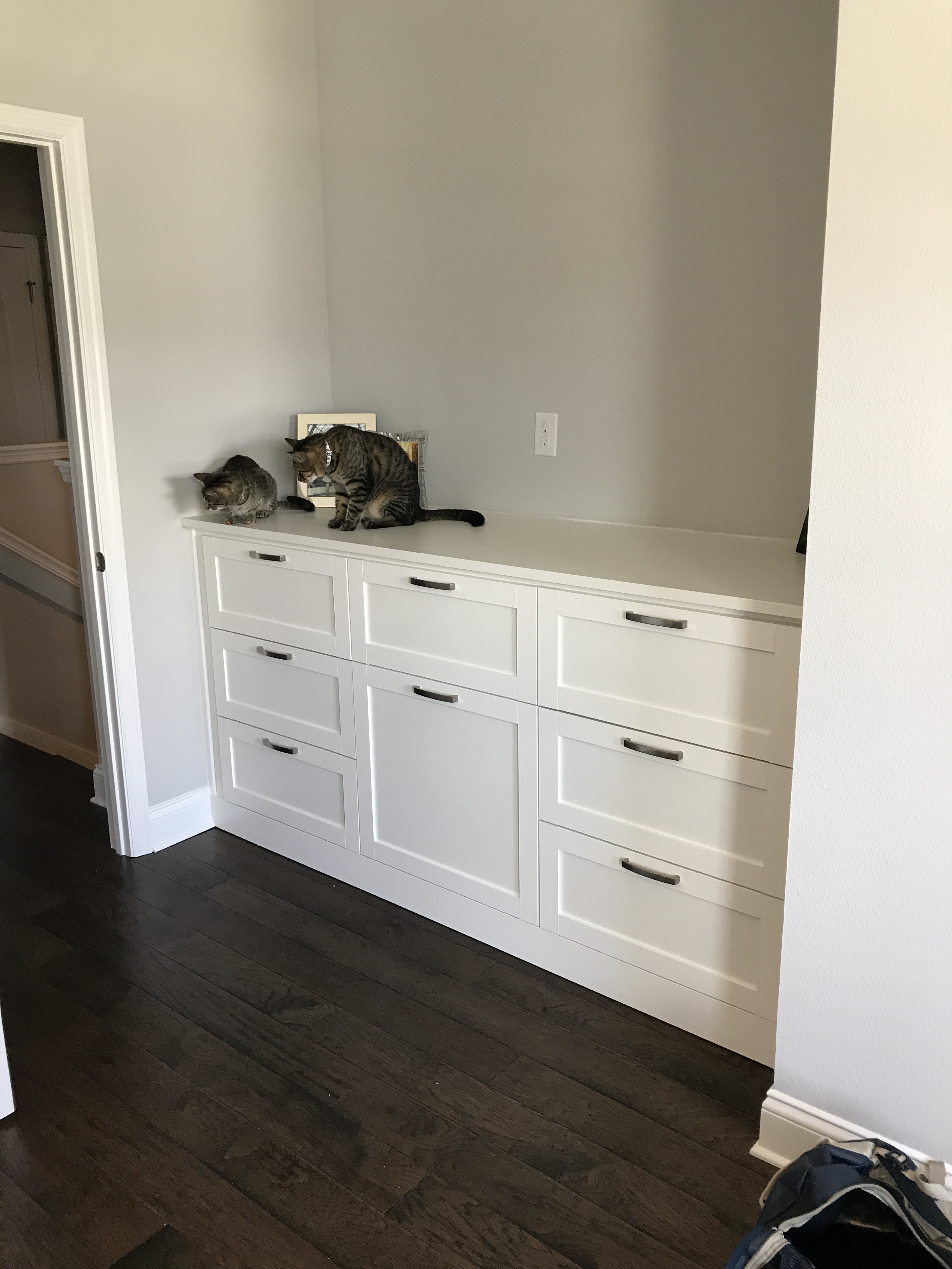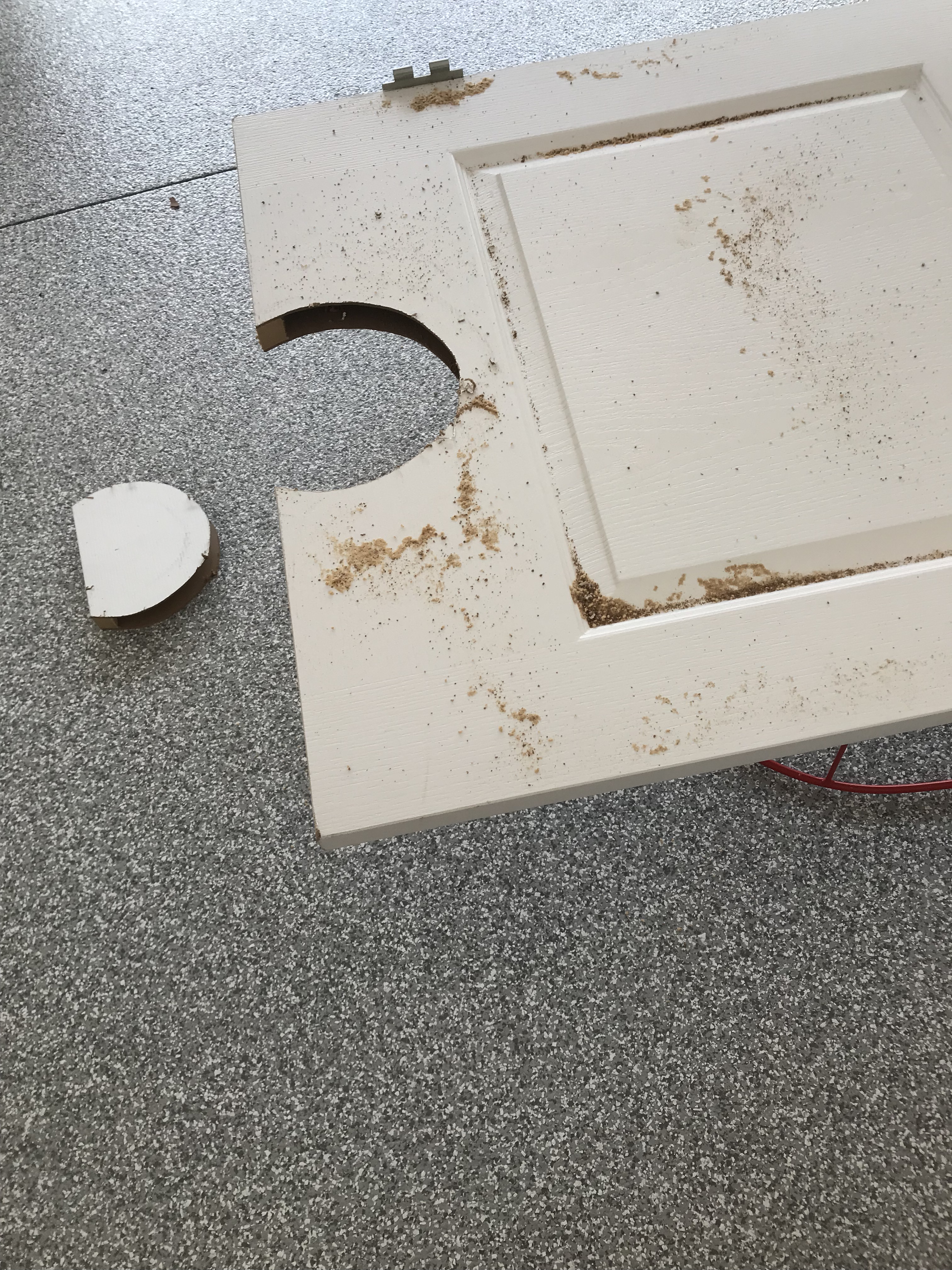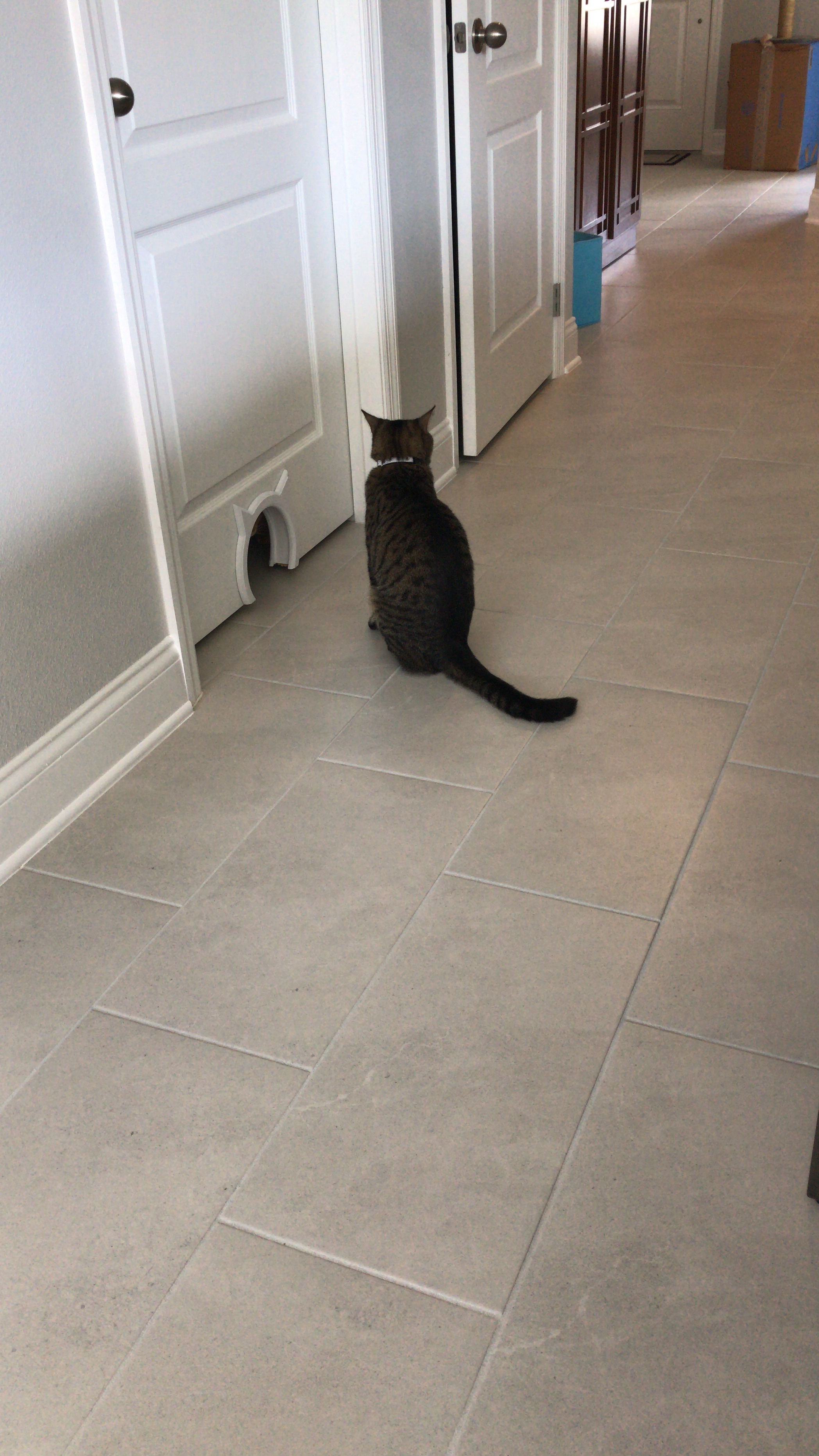 I got the door hung back up and the kitties seem to like it (it did take Ziggy a bit of time to figure it out)! Now we can keep the laundry room door closed and they can get to their food and litter boxes.