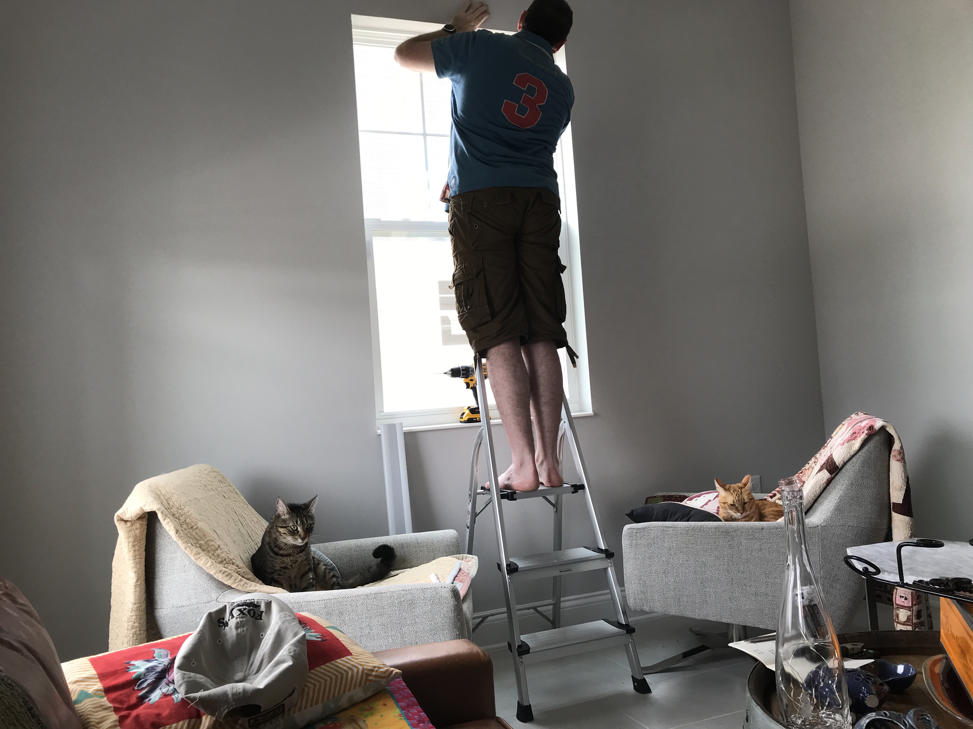 Then I started on my project for the morning- installing the cat door for the laundry room. I got the door off the hinges without much problem and out to the garage, traced the cut out on the door and got out our new saw. A new saw that doesn’t come with a battery, So I had to go back to the store and get the battery!