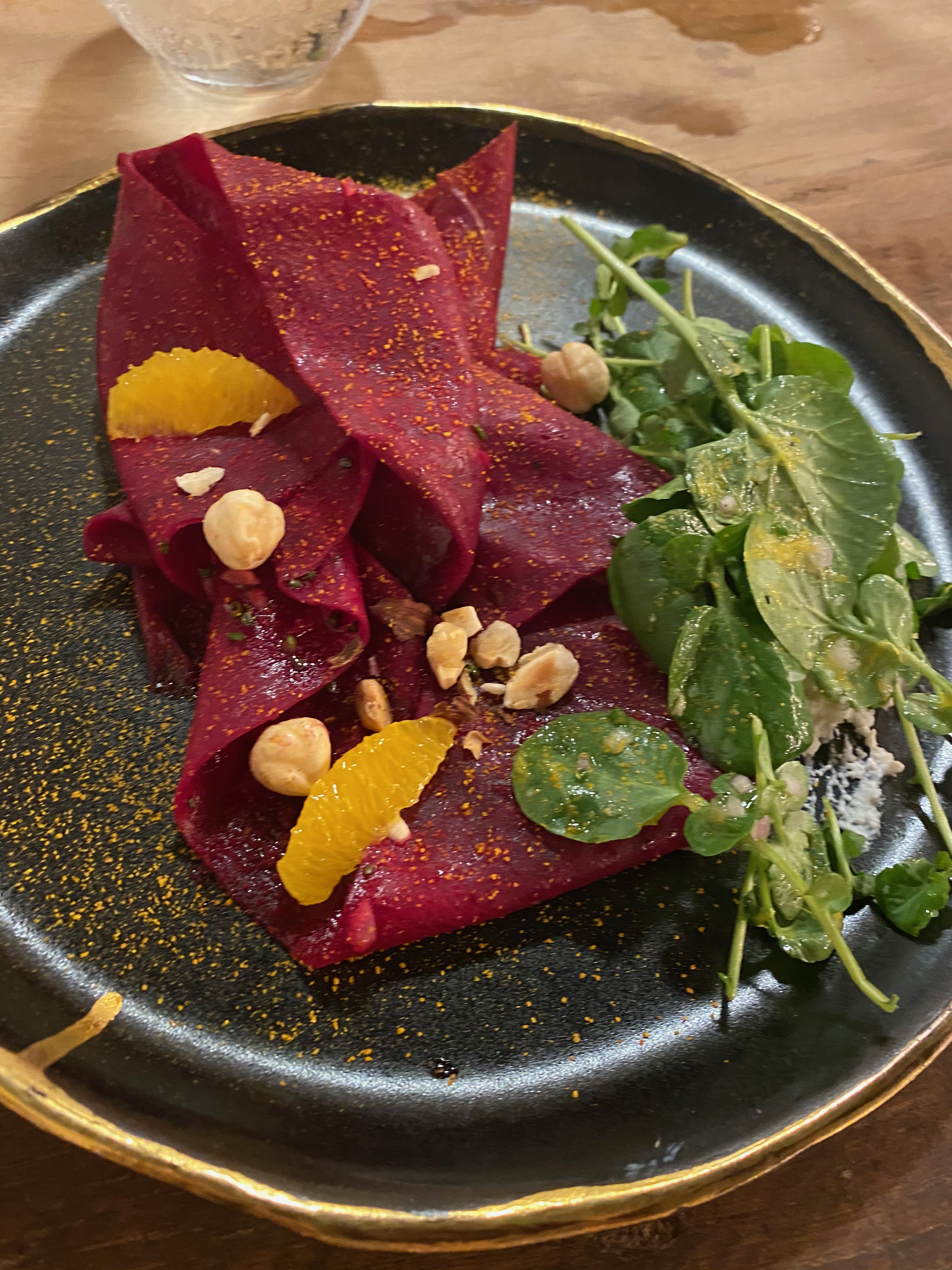 For starters Richard ordered the salmon and although it tasted nice it was served in a bowl and didn’t have much salmon in it. I ordered the roasted beets with a goat cheese and the beets were not anything special, but the goat cheese was really nice!