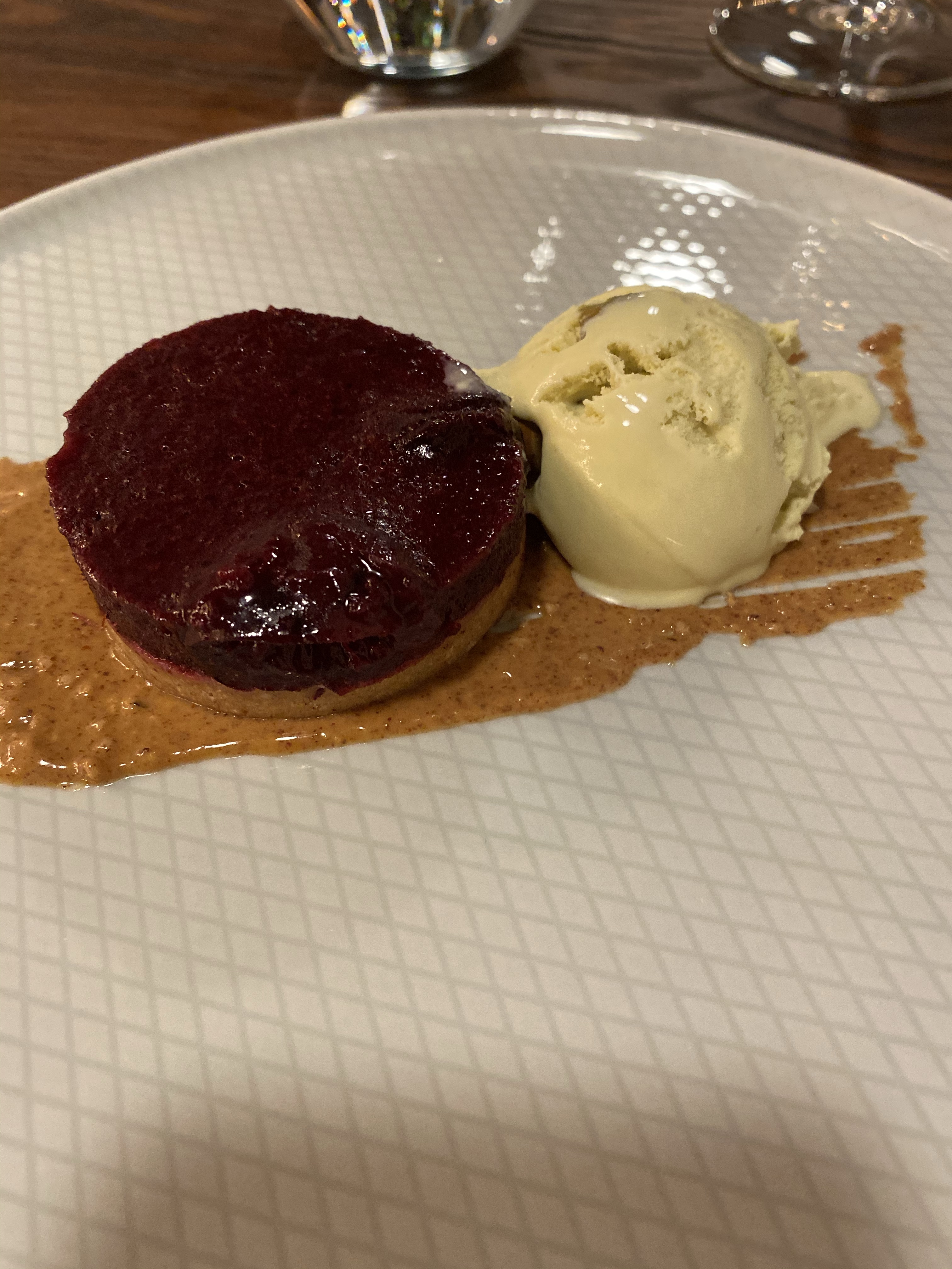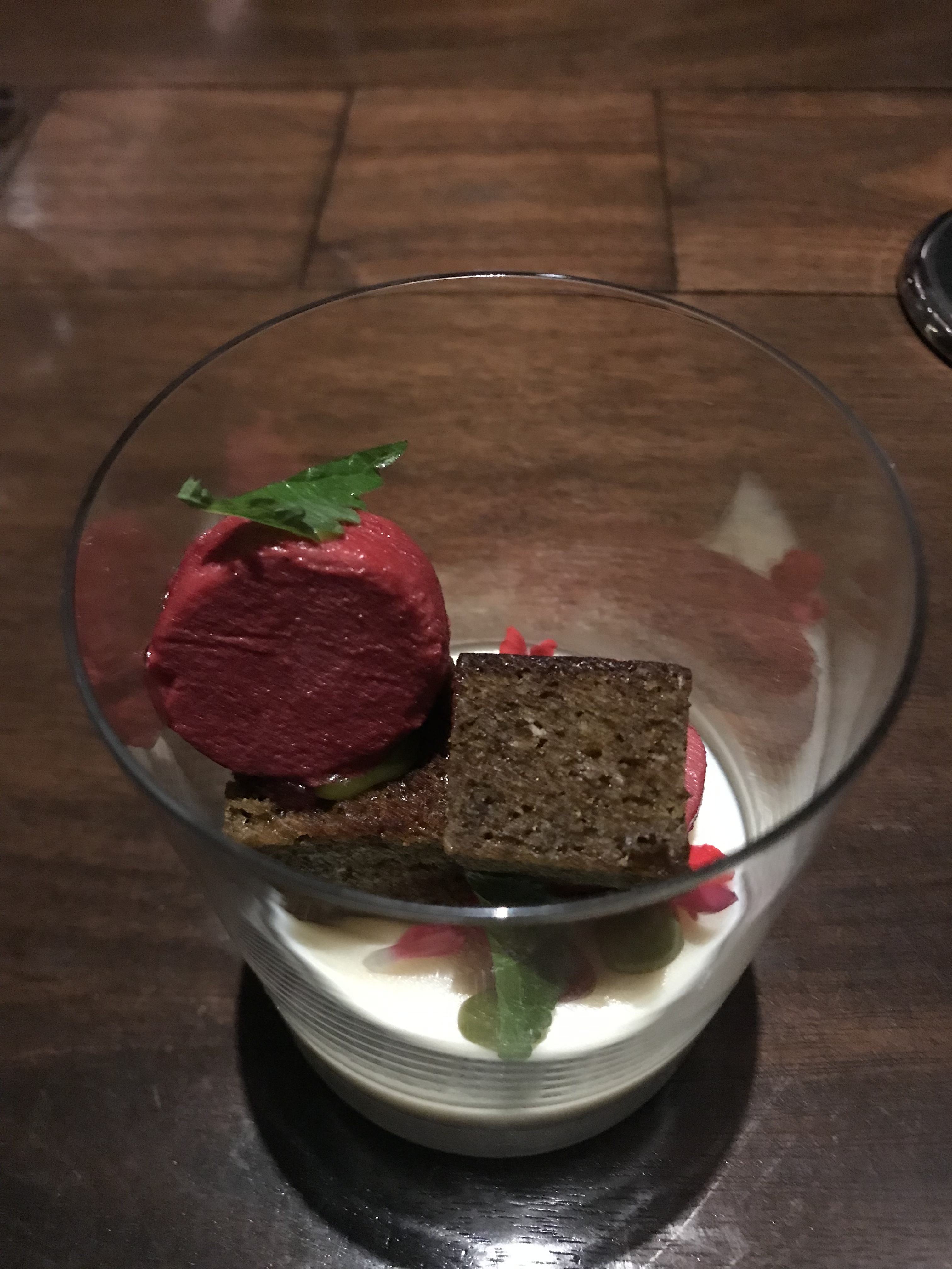 We ended with Pistachio. It was a white chocolate cream with a cherry sorbet and a lemon balm cake.