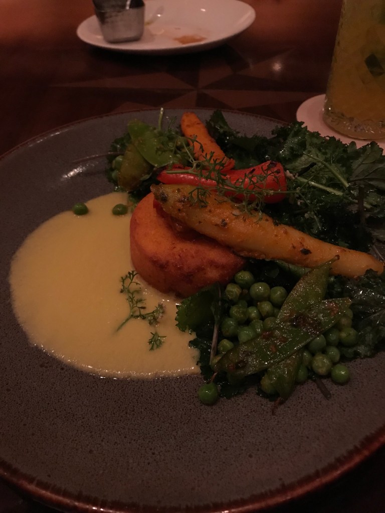 For my main I had a crispy corn cake with chermoula- infused vegetables and a corn emulsion. It was even better than the starter! I finished the meal off with a cheese plate and a nice cup of tea.