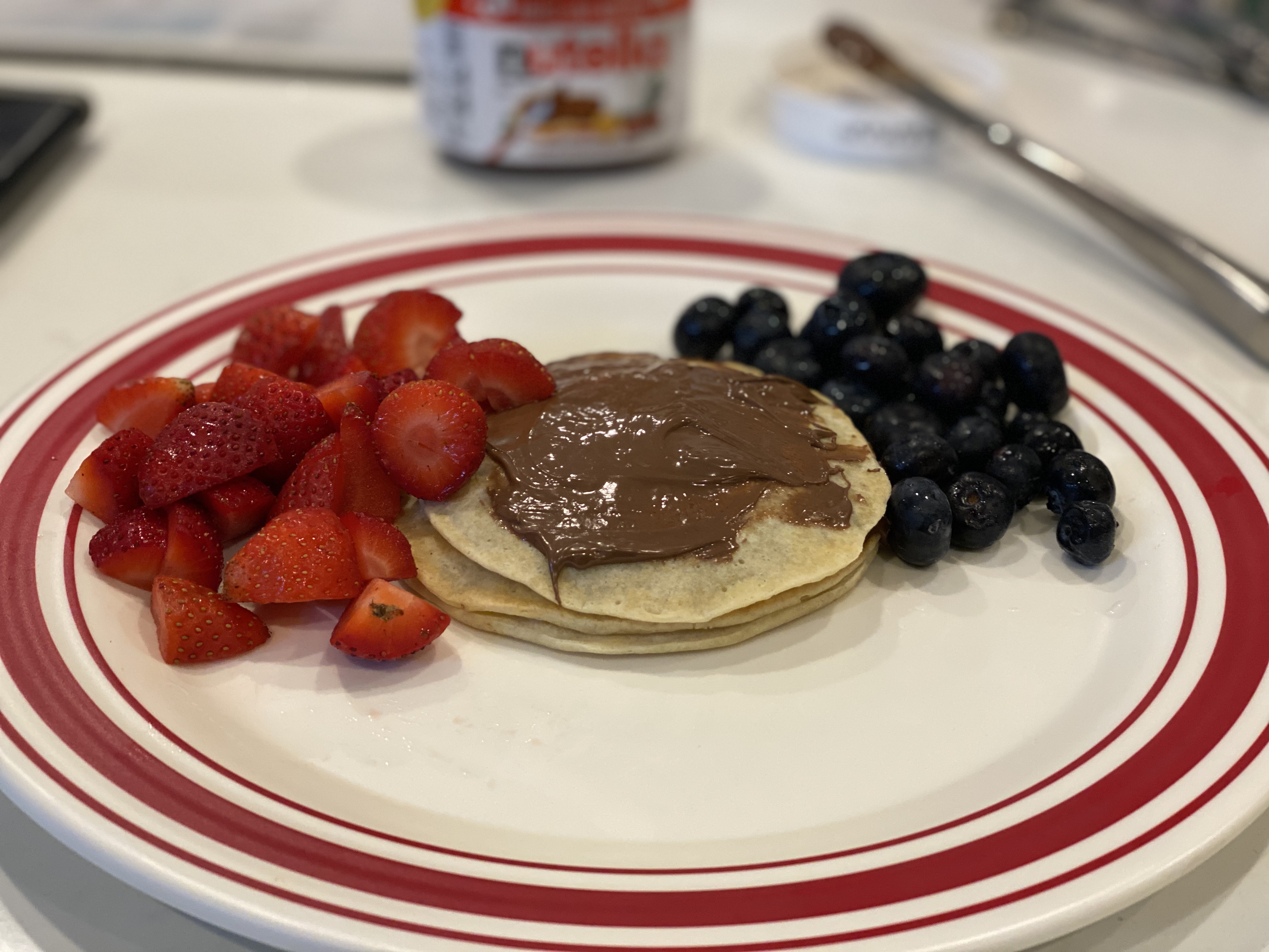 So, being stuck in the house and I wanted something sweet so I made some pancakes from scratch. they actually turned out pretty good. Unfortunately I didn’t have any syrup so I had to top them with peanut butter and some of Richards Nutella!