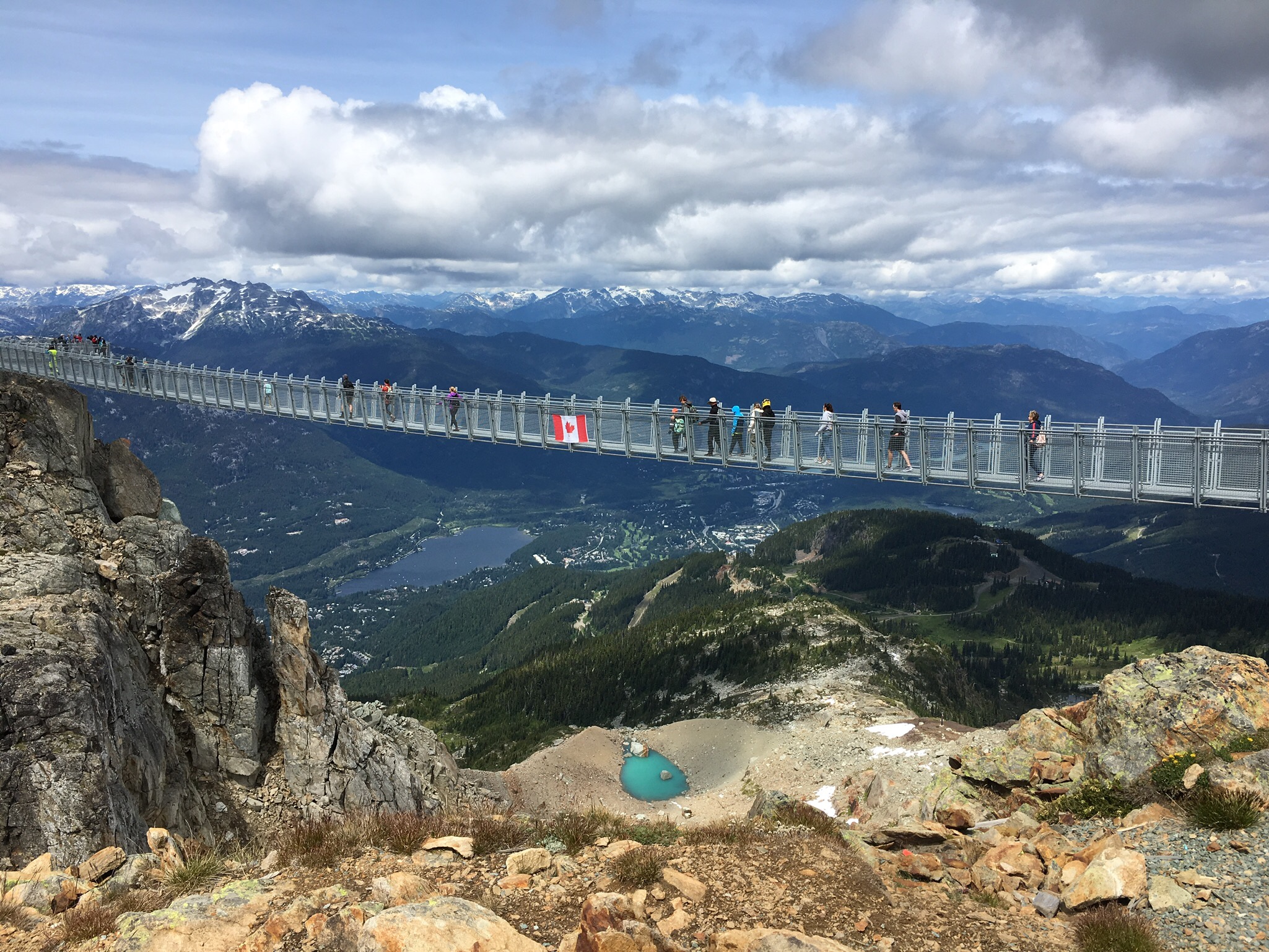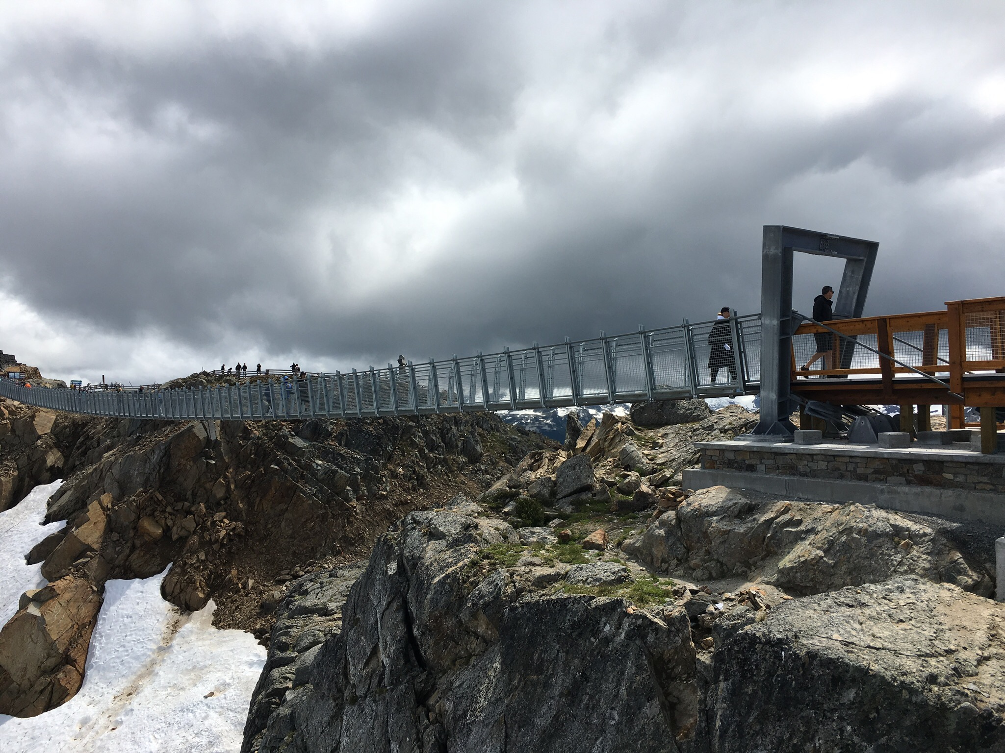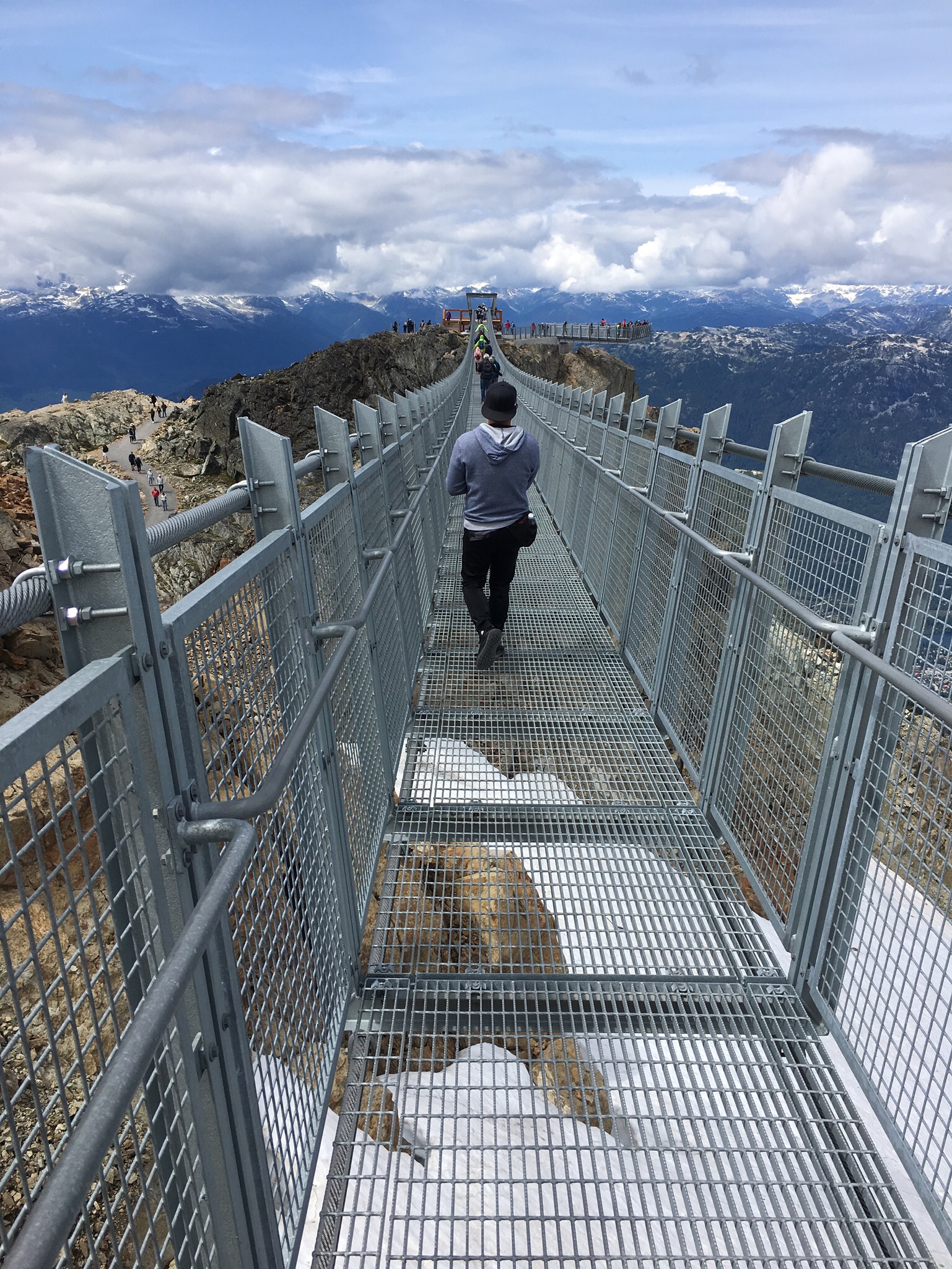 Today was another active day as we headed out to hike up Blackcomb mountain and across to Whistler mountain. After taking the gondola ride part way up, temperatures up the mountain were a very brisk 7C. We had a good hike across the mountain to a lake where we paused for tea before continuing on and taking the Peak to Peak gondola across to Whistler mountain where we stopped for lunch. Although the sun sometimes made it through the cloud it was largely a cold day. Nick and I continued on up to the peak of Whistler mountain and took a walk on the suspension bridge up there. The views all around were just stunning. We ended the day by going to see the weekly live concert in the park in downtown – the band had a lot of people up in front of the stage dancing away despite the cold temperatures as the sun disappeared behind the mountains for the night.
