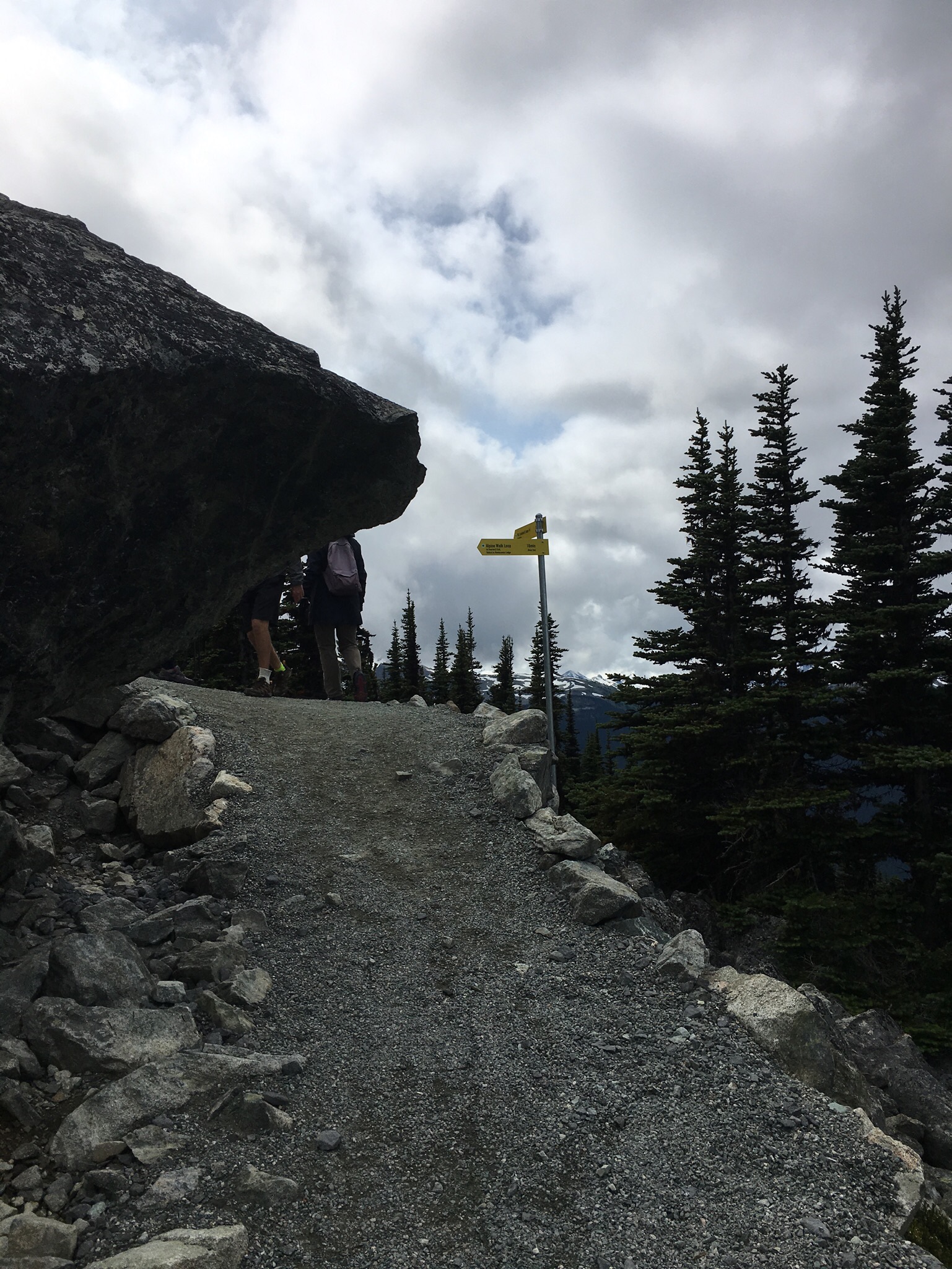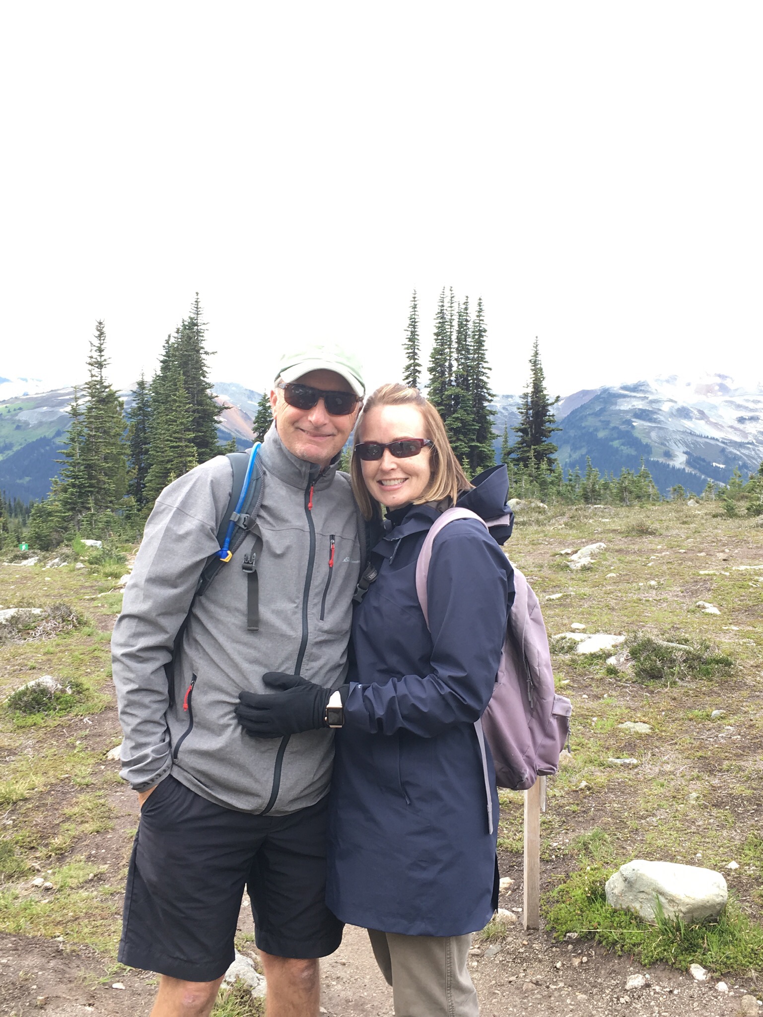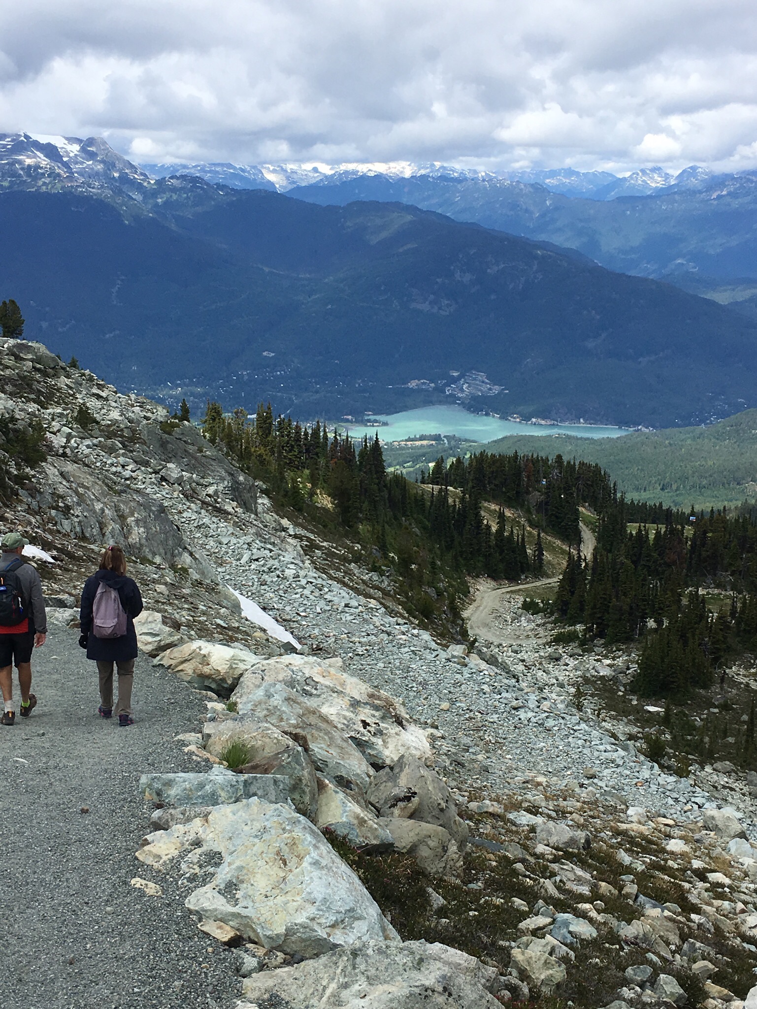 Today was another active day as we headed out to hike up Blackcomb mountain and across to Whistler mountain. After taking the gondola ride part way up, temperatures up the mountain were a very brisk 7C. We had a good hike across the mountain to a lake where we paused for tea before continuing on and taking the Peak to Peak gondola across to Whistler mountain where we stopped for lunch. Although the sun sometimes made it through the cloud it was largely a cold day. Nick and I continued on up to the peak of Whistler mountain and took a walk on the suspension bridge up there. The views all around were just stunning. We ended the day by going to see the weekly live concert in the park in downtown – the band had a lot of people up in front of the stage dancing away despite the cold temperatures as the sun disappeared behind the mountains for the night.