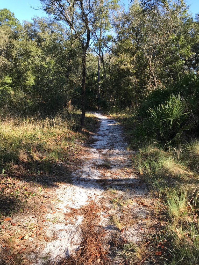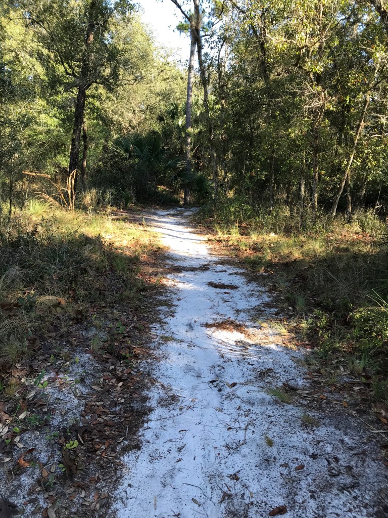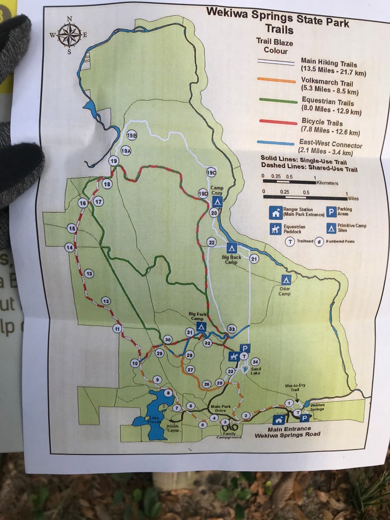 This morning I decided to start my hiking training by heading up to Wekiwa Springs (https://en.wikipedia.org/wiki/Wekiwa_Springs_State_Park). The park opened at 8 so I was there a few minutes early only to see a cue of cars waiting to get in, so I was about the 10th car into the park when they opened. The initial plan was to hike 5.3 miles along the Volksmarch Trail (orange line)… at least that was the plan. I ended up on the main hiking trail, which is 13.5 miles (white lines). The good thing is I had plenty of food and water, so as long as my legs held up I would be ok.